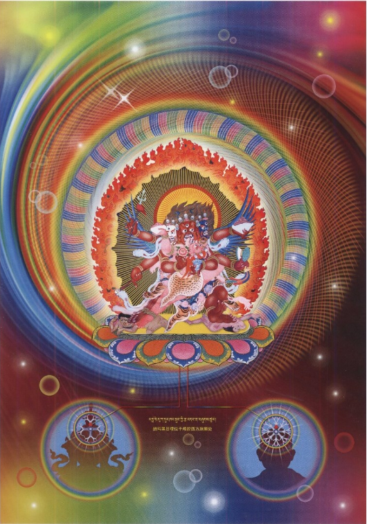此法亦尔。饮血圣众,身形庞大,肢体粗壮,量等虚空,当其现前,定生惊怖。若闻此教授,明白指示,无间即证为本体境相,或认为自之本尊,则生前所修之明光(子光),及后起自然之明光(母光),子母两光会遇,于朗然释然中,如遇故知,恍然大悟。若不得此教授,虽诸贤者,亦复难免退堕,流转生死大海而已。