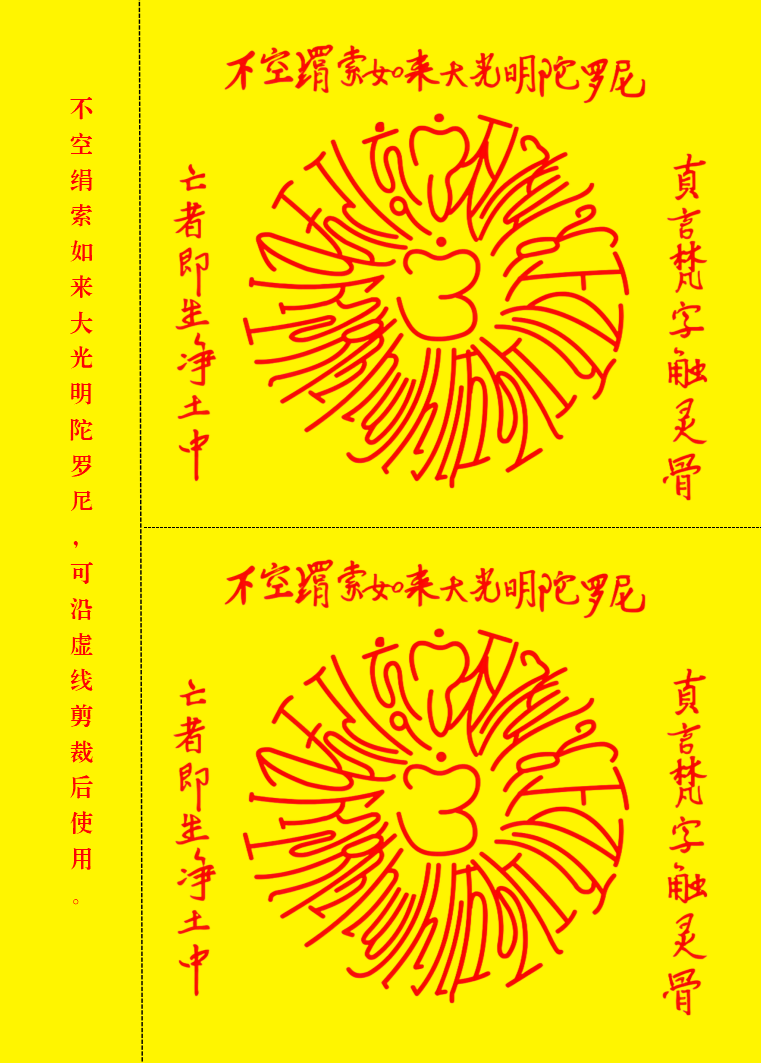 下图为元音上师传授的大光明咒梵字图。真言梵字触灵骨,亡者即生净土中(请用黄色纸打印,打好后,持咒印加持至少 108 遍)。
